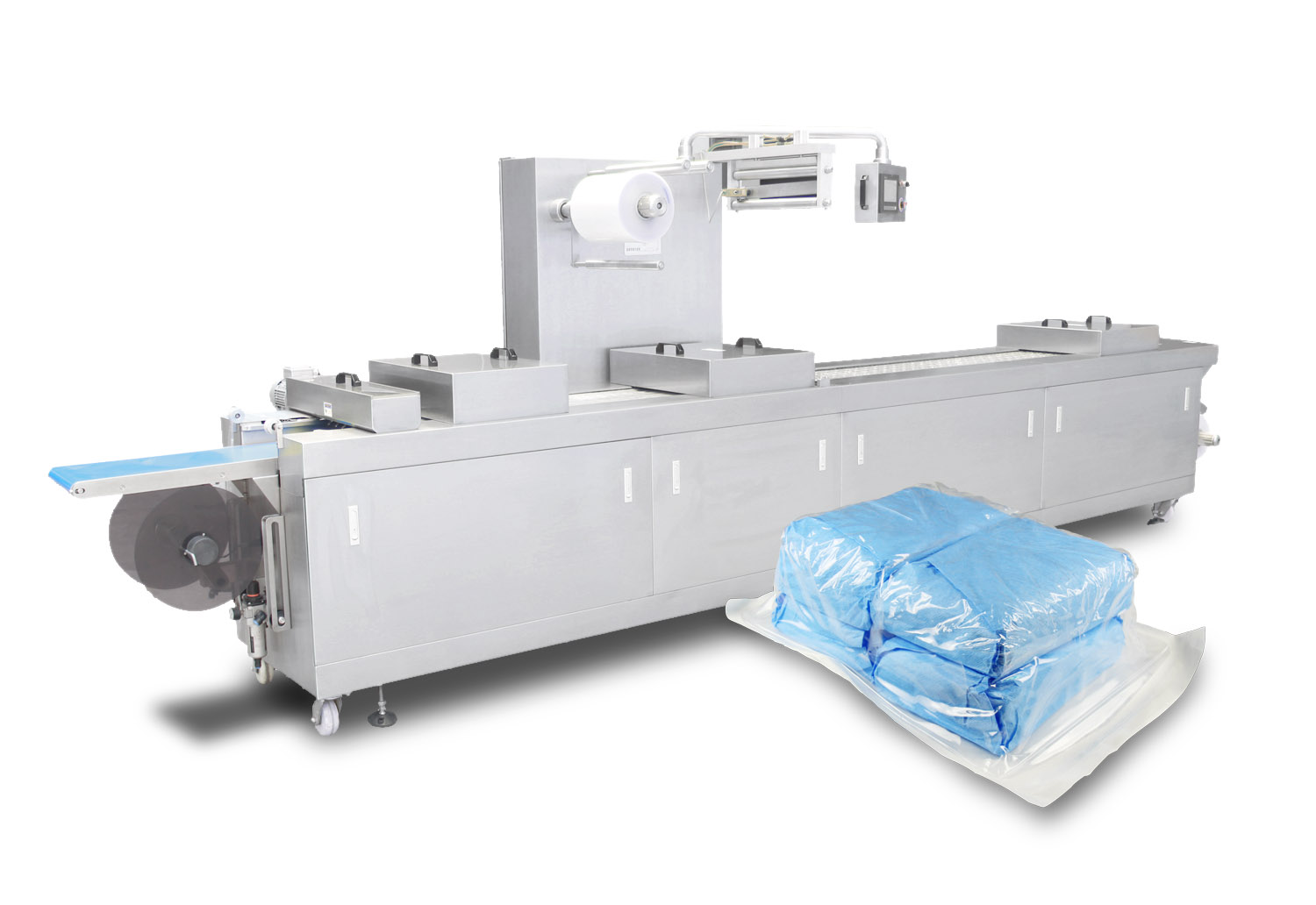 食品真空包裝機將食品裝入包裝袋,抽出包裝袋內(nèi)的空氣,達到預(yù)定真空度后,完成封口工序。