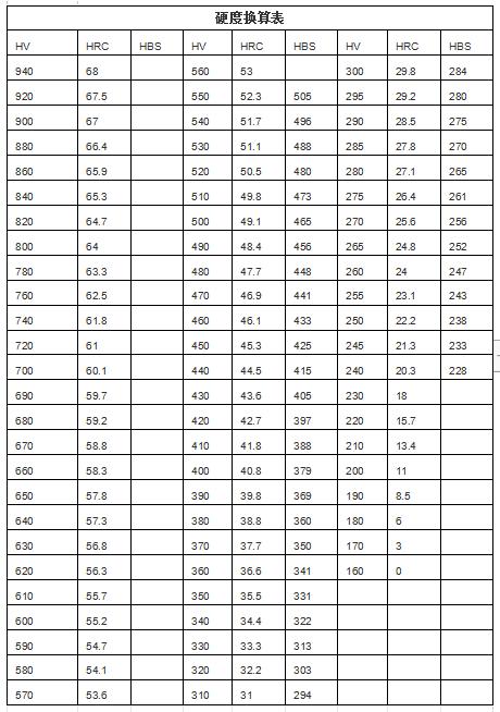 除去洛氏硬度HRC,還有維氏硬度HV,布氏硬度HB,不同的材質(zhì)所用的硬度檢測表示方法不同,它們之間可以換算。換算表如下,可以參考下: